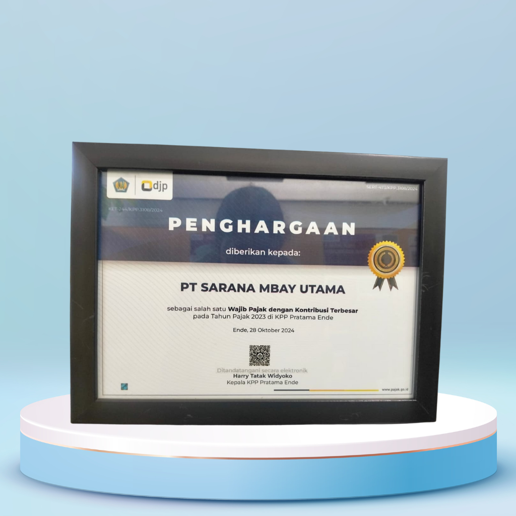 Wajib Pajak dengan Kontribusi Terbesar 2023PT Sarana Mbay Utama memperoleh penghargaan dari KPP Pratama Ende sebagai salah satu wajib pajak dengan kontribusi terbesar pada tahun pajak 2023